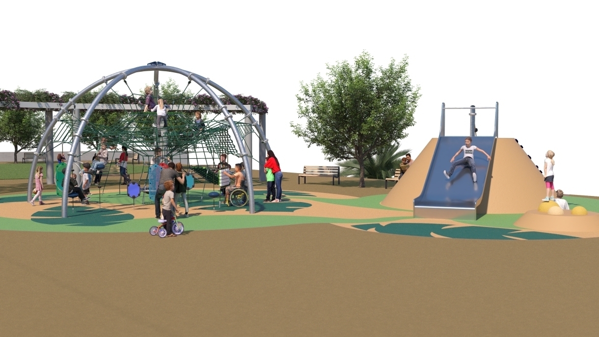 Cúpula d’exploració sensorial amb cordes amb capacitat per a 52 infants i tobogan sobre dunes artificials.