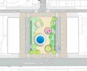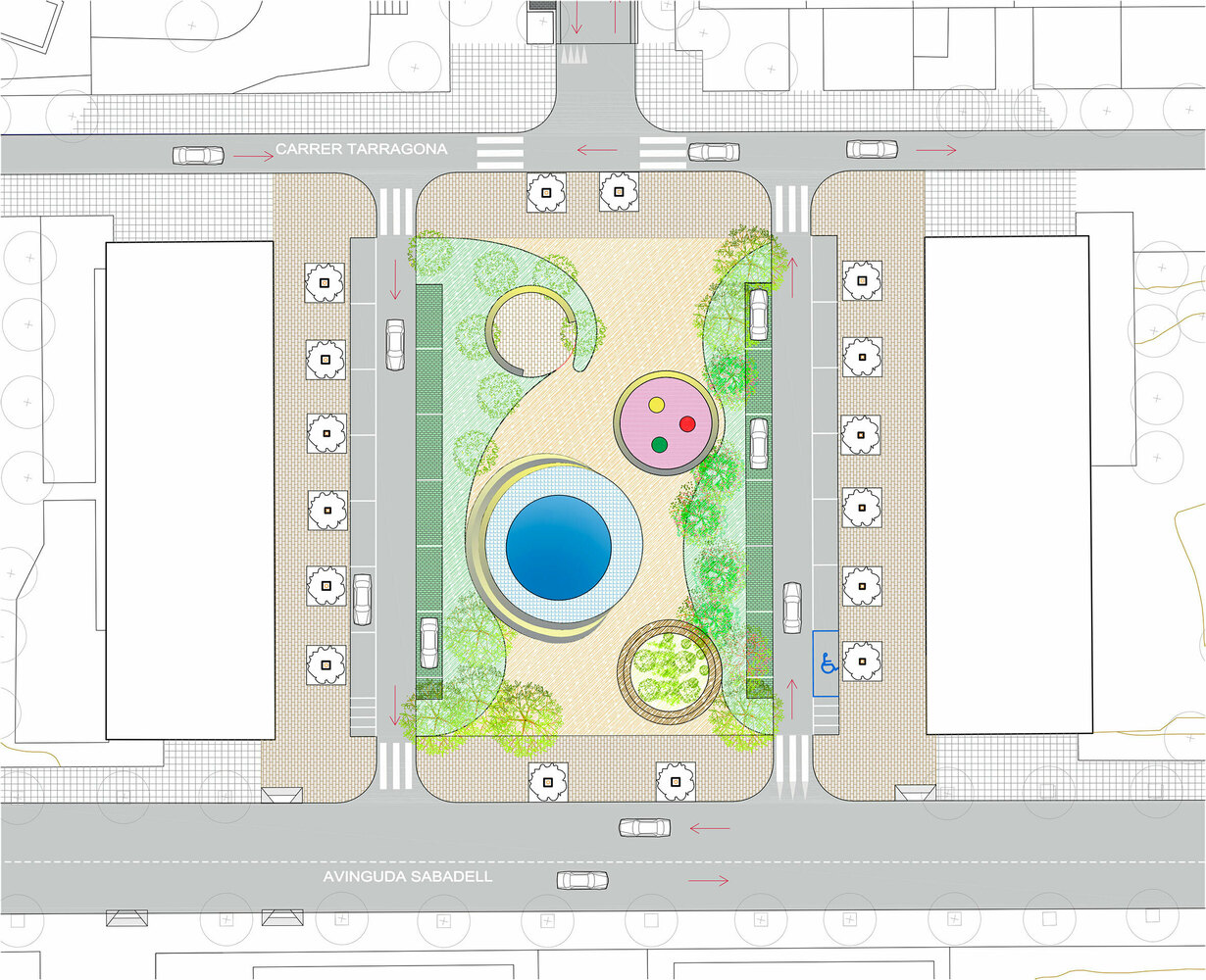 La zona central es concep com a àrea lúdica amb múltiples usos per a la ciutadania i una presència important de vegetació que renaturalitza l’espai. L’arbrat i la vegetació se situa al voltant de la plaça creant una anella verda que acota els espais.